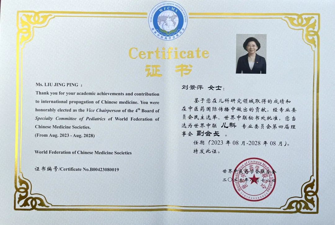 巅峰国际药业集团党委书记、董事长刘景萍当选世界中医药学会联合会儿科专业委员会第四届理事会副会长