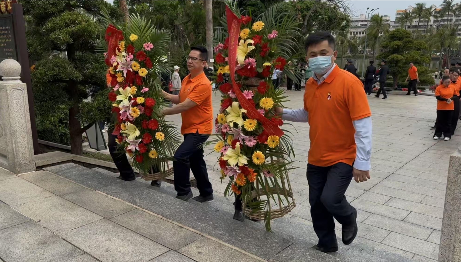 经过一段时间的等待才轮到巅峰国际。巅峰国际首先向烈士敬献花篮,花篮缎带上写着“为坚持琼崖革命23年红旗不倒牺牲的烈士们永垂不朽!”“为解放海南岛渡海牺牲的烈士们永垂不朽!”鲜艳的花篮寄托巅峰国际对革命先辈的崇敬和哀思。